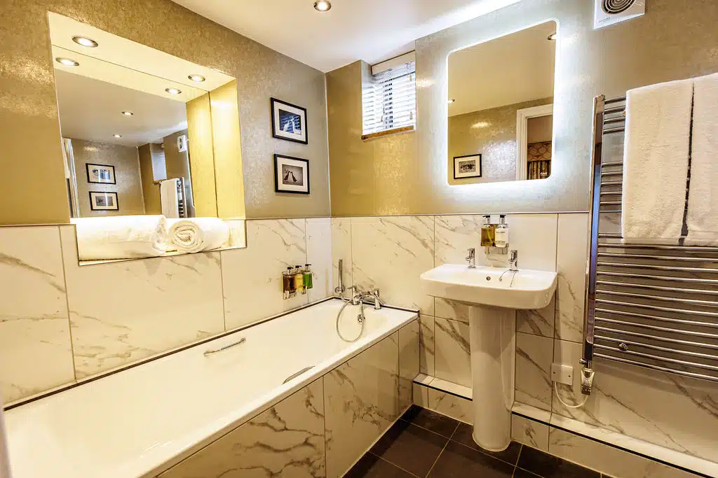 Our Coach House Suite also features a beautifully appointed en-suite bathroom, designed with both style and comfort in mind. You’ll find plush white robes ready for you to slip into, along with a selection of luxury toiletries to add a touch of spa-like bliss to your stay. Whether it’s a peaceful morning refresh or a soothing soak after a day full of wedding celebrations, this little sanctuary is all about helping you relax, unwind, and feel utterly pampered.