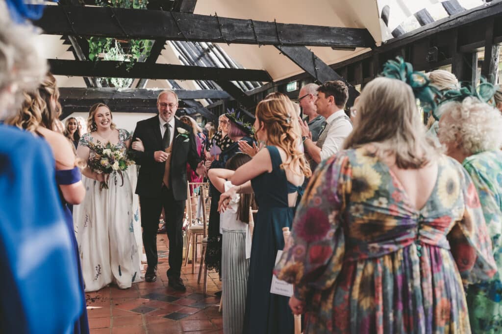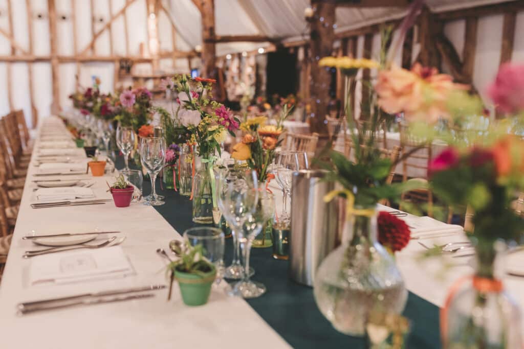 From an intimate ceremony and drinks reception in the Old Dairy, to an evening of dancing in our light-filled Horse Barn, every moment of the day reflected who they are – a wedding celebration done entirely their way, which we absolutely loved! Their highlights included a private first look in our charming Farmhouse Entrance Hall, creative theatre-ticket table plans complete with personalised Spotify codes, eco-friendly dried-flower bouquets, and even a glitter artist bringing extra sparkle to their wonderful wedding day with us. Set within our countryside wedding venue in Hertfordshire, their day was a fabulous blend of personality, creativity and heartfelt moments.
